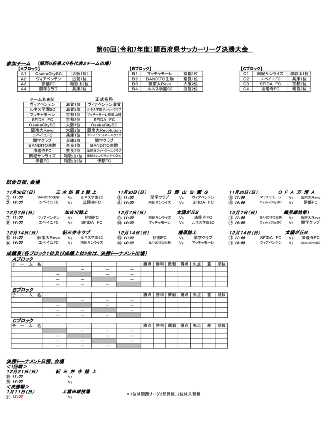 優勝チームが関西リーグ2部への自動昇格、準優勝チームは入替戦へ進みます。